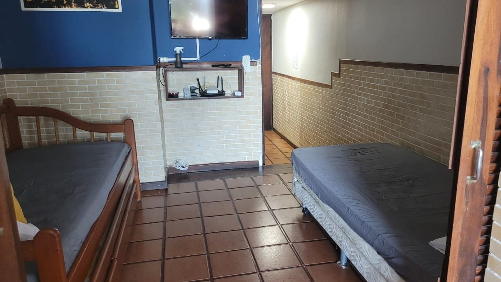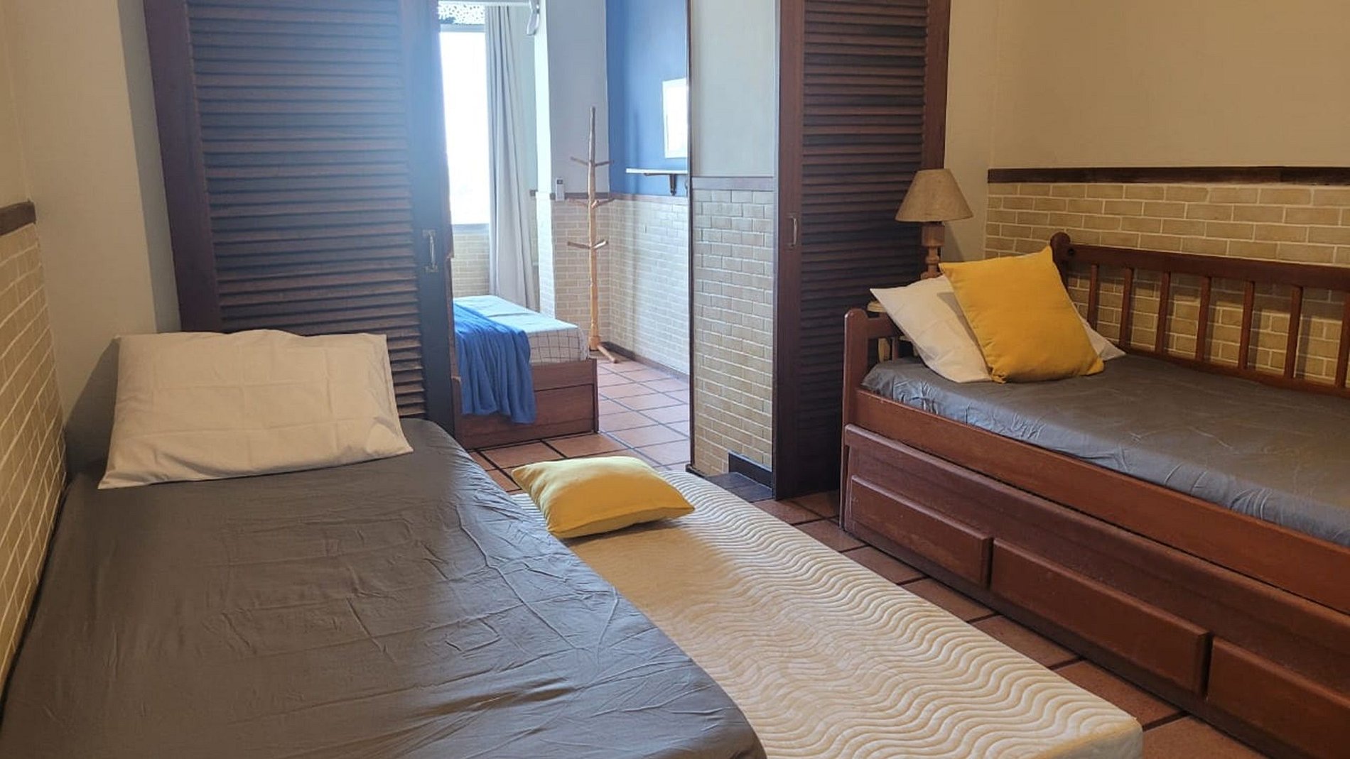 O apartamento é dividido em quarto, sala, cozinha e banheiro. Para acomodar todos os hóspedes, tem 1 cama de casal no quarto, e 2 camas de solteiro com 1 cama auxiliar na sala. Já para refrigeração, o apartamento tem ar condicionado no quarto e ventiladores de teto no quarto e na sala. A cozinha é equipada com utensílios básicos para preparar refeições, como por exemplo, panelas, pratos, talheres, copos, microondas, geladeira e fogão de duas bocas com um pequeno forno. A tv é de 32" e é smartv, onde você poderá utilizar sua conta para acessar os principais serviços de streaming. Para comodidade, disponibilizamos também roupa de cama e toalhas.