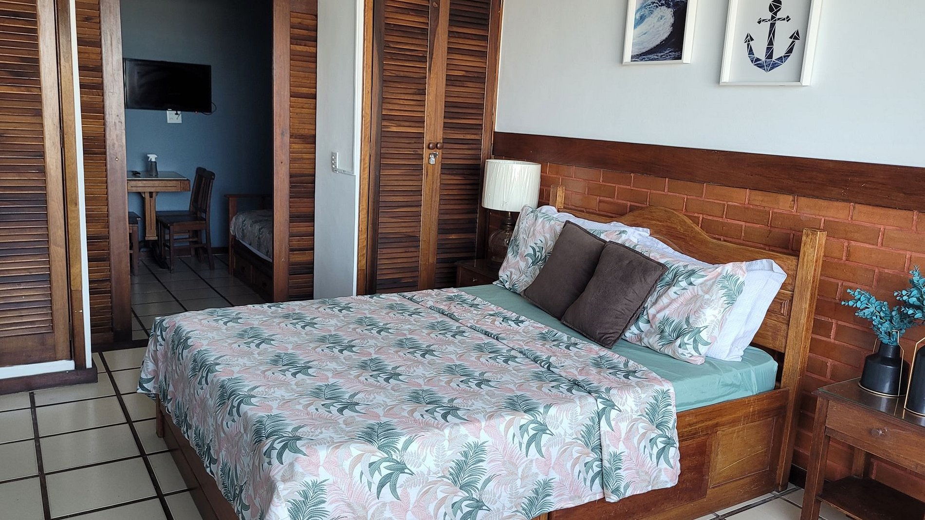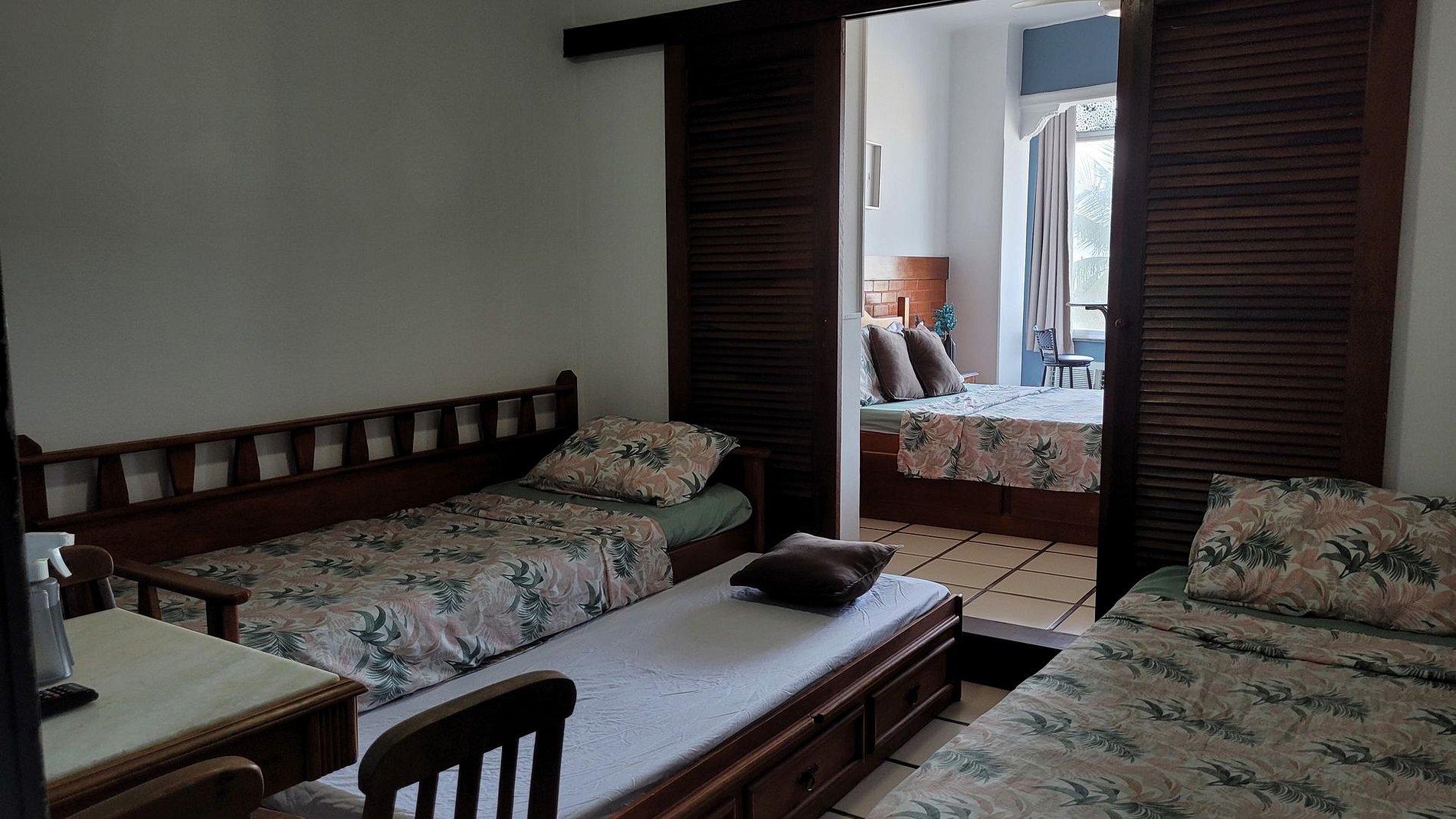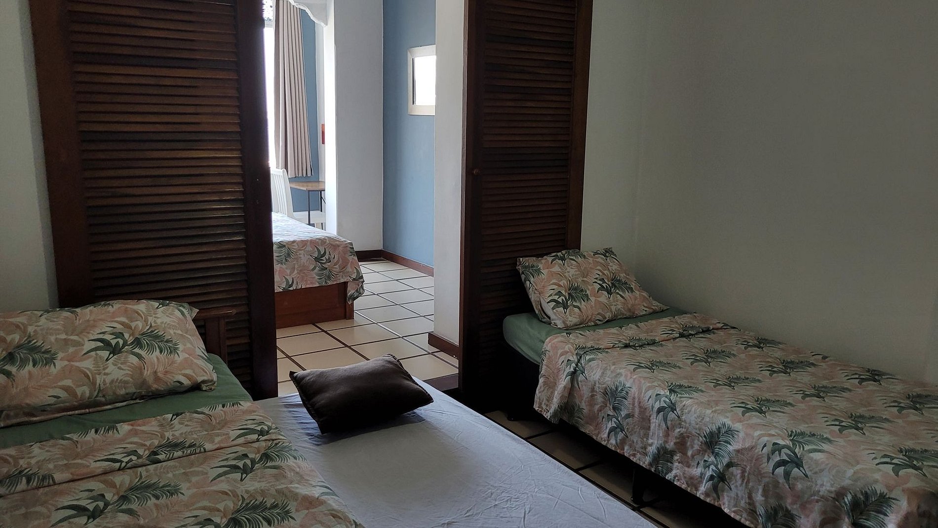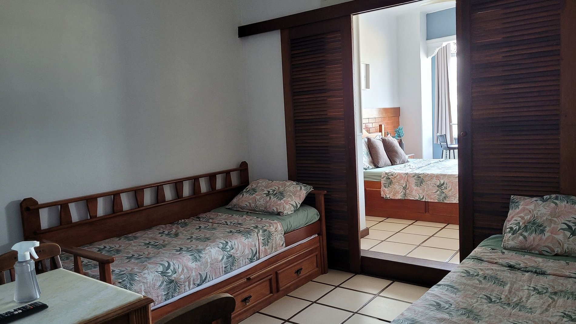 Para acomodar todos os hóspedes, tem 1 cama de casal no quarto, e 2 camas de solteiro com 1 cama auxiliar na sala.