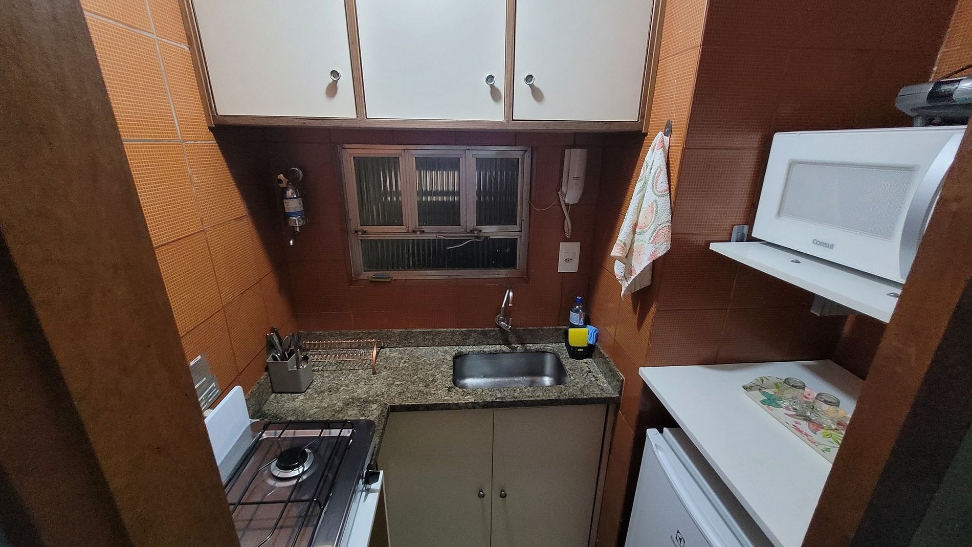 A cozinha é pequena, mas é equipada com utensílios básicos para preparar refeições, como por exemplo, panelas, pratos, talheres, copos, microondas, frigobar e fogão de duas bocas com um pequeno forno.