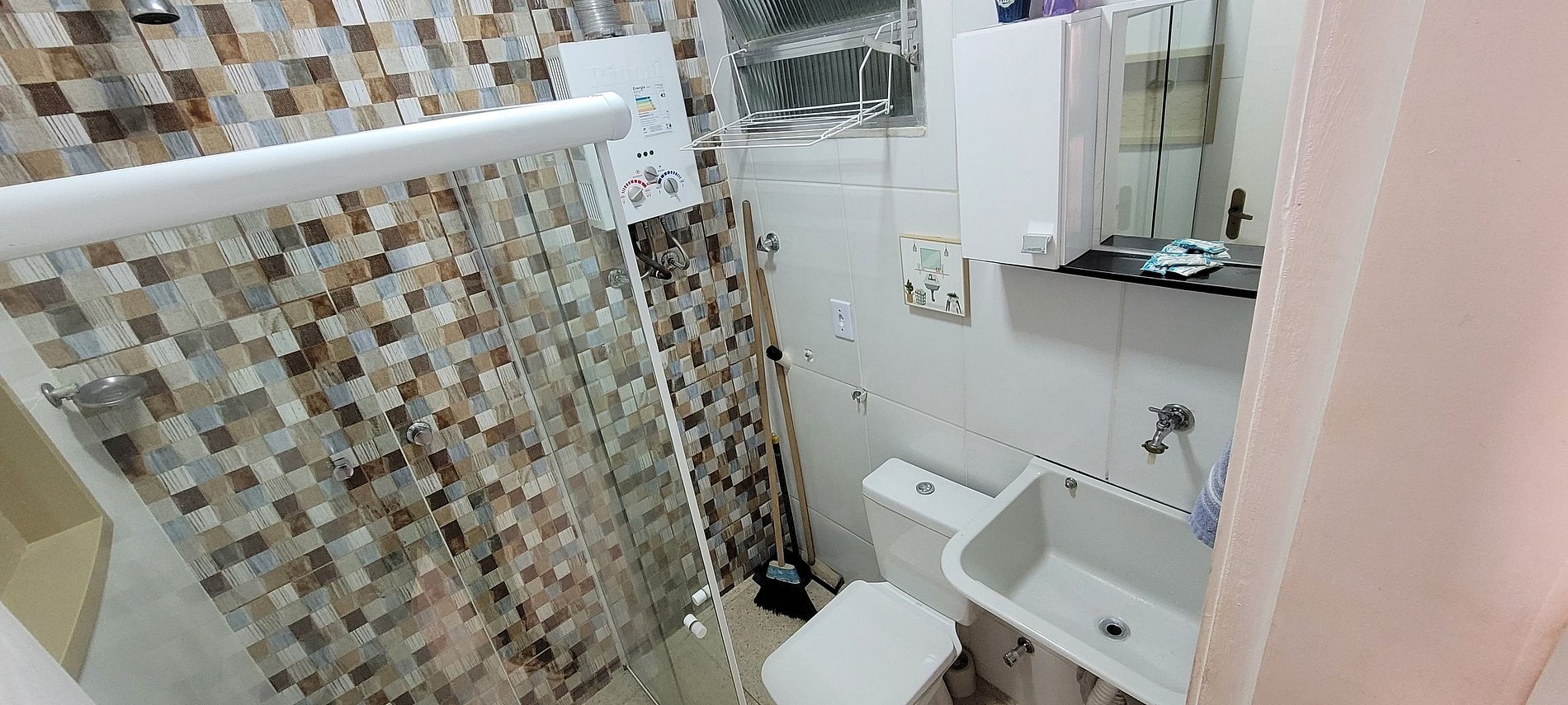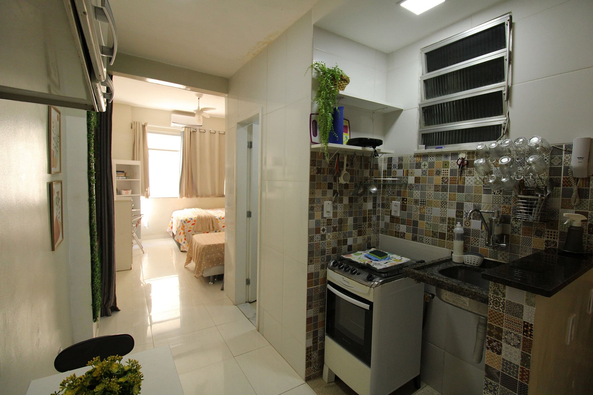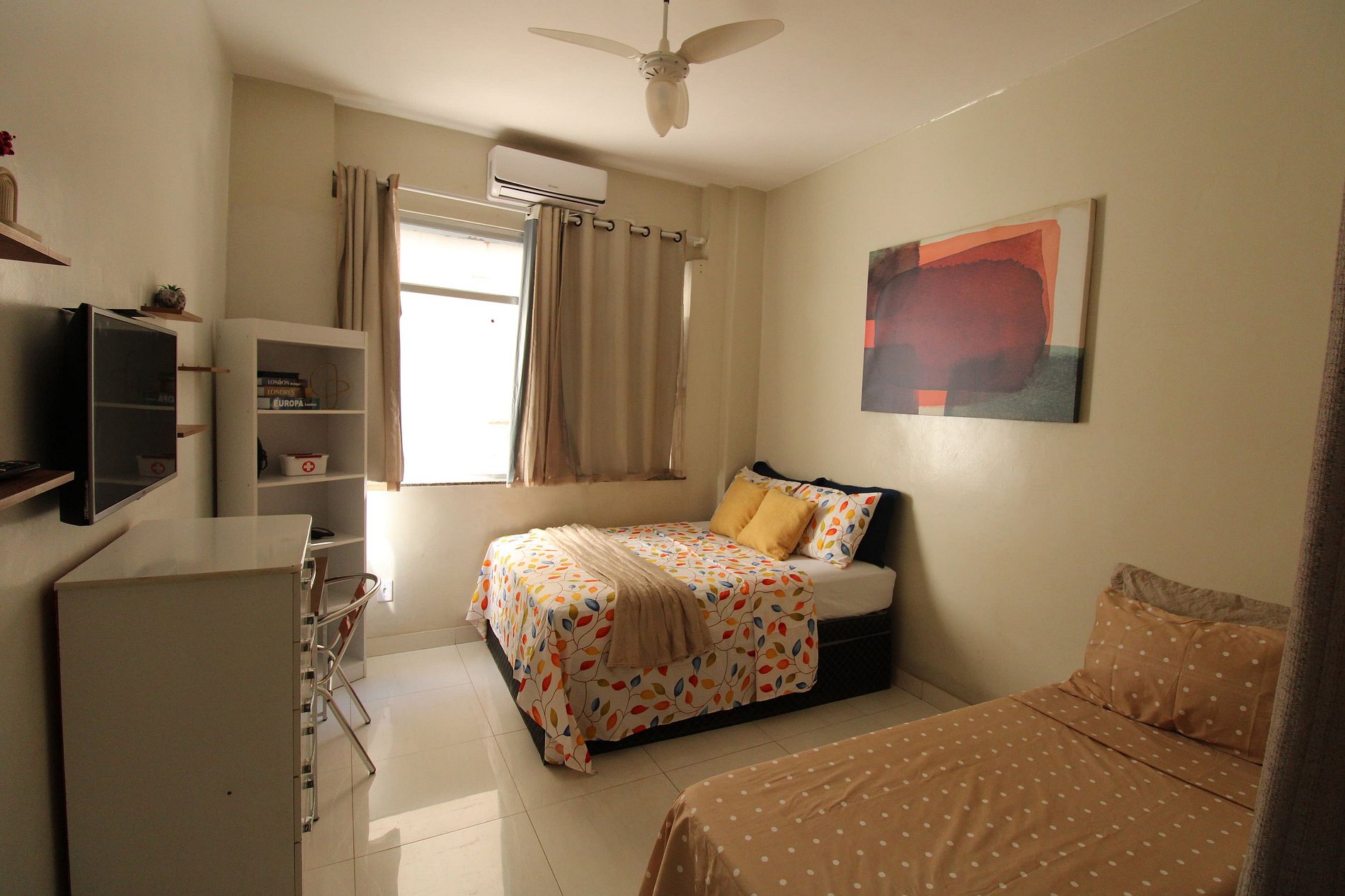 Já para refrigeração, o apartamento tem ar condicionado e ventilador de teto no quarto.