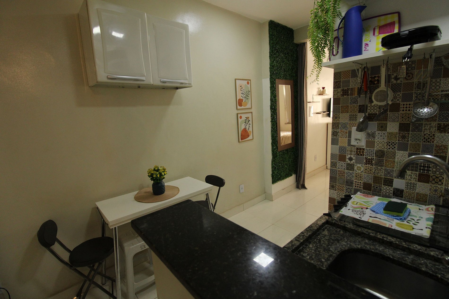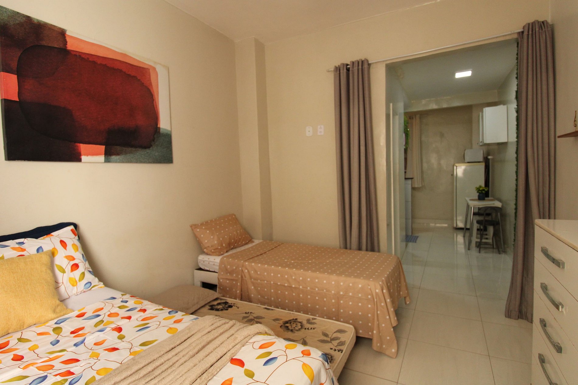 O apartamento é dividido em quarto, cozinha e banheiro.